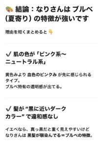 イエベなら、真っ黒だと重く見えやすいけど、なりさんは黒髪が馴染んでる=ブルベの特徴。
