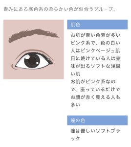 写真の明るい環境でも、肌の影が赤みより青みになってるのがブルベ夏の特徴。