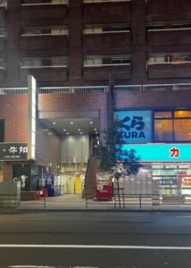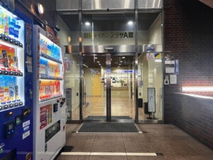 新宿ダイカンプラザA館のエントランスは、カラオケ館とラーメン店「味八」の間の“凹み”にあります。