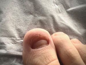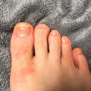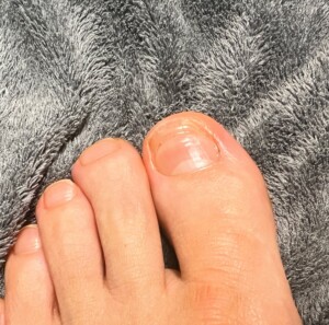 A. 半年〜1年は見てください。足の爪(特に親指)は伸びるのが遅く、1ヶ月に約1.5mm〜2mm程度しか伸びません。根元から先端まで完全に生え変わるには、10ヶ月〜12ヶ月ほどかかります。現在はまだ「工事半ば」の状態です。